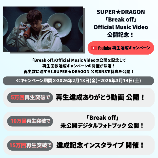 第一弾は、「Break off」Official Music Video公開記念「再生達成キャンペーン」!
